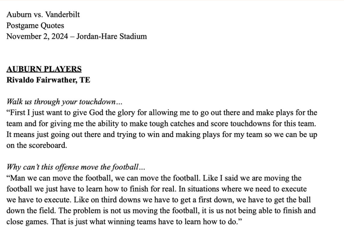 I was responsible for managing all media credentials, checking in and organizing hundreds of media professionals including journalists, photographers, and student workers. I ensured all credentialed individuals adhered to Auburn’s sideline policies and acted as a liaison between the athletics department and media personnel throughout the game. I also helped set up the press box, restocked supplies, and served food to media and staff. In addition to game day operations, I assisted with updating the Auburn Football website, including player photos, bios, and season statistics. I attended post-game press conferences and weekly media interviews, where I recorded and transcribed player and coach quotes for use in official communications and media outlets.