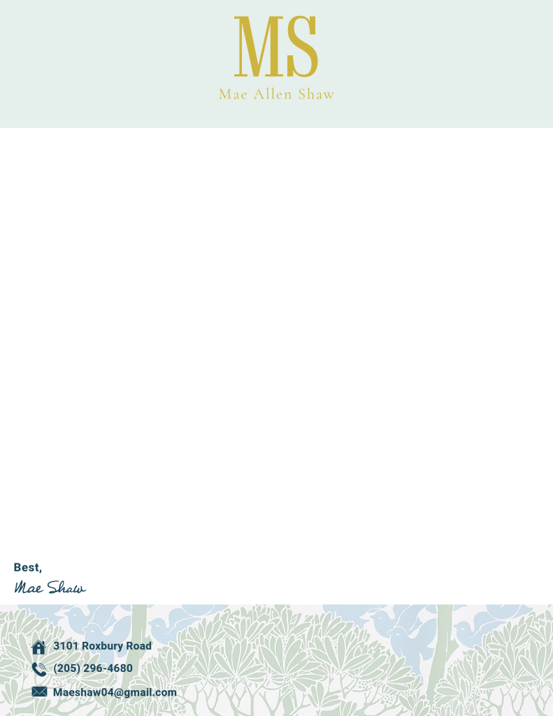 When designing my cover letter template, my goal was to create a piece that felt both polished and personal while staying true to my overall brand identity. I incorporated the same consistent color palette, typography, and subtle pattern used throughout the rest of my branding to maintain visual cohesion. The layout is clean and professional, allowing the content to stand out while still reflecting my creative style. To make it feel uniquely mine, I included a personal signature at the end, tying in a warm, human element that aligns with my brand’s tone. Every detail was chosen to give future employers a clear sense of who I am—professional, intentional, and creatively driven.