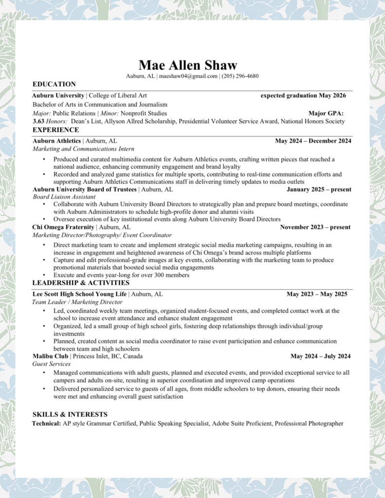 For this project, I kept my resume professionally written and optimized for AI scanners, ensuring clarity and functionality. To align with my overall brand, I incorporated my background pattern, adding a personal touch while maintaining a polished and clean layout. This approach allowed me to present my experience professionally while still reflecting my unique style.
