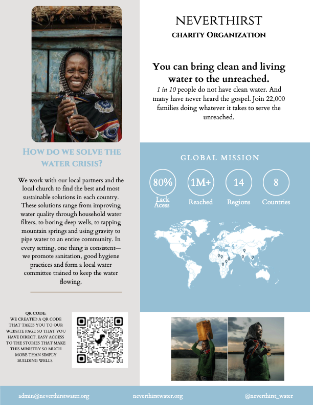 A media pitch is a brief, personalized message sent to journalists or media outlets to persuade them to cover a story, event, or organization. As a PR student, I learned the importance of crafting strong, targeted pitches that clearly communicate news value while aligning with the mission and tone of the organization—in this case, Never Thirst, a ministry I’m deeply connected to. Writing an effective pitch requires skills in concise writing, audience awareness, and research to ensure the content is relevant and compelling. It’s also an opportunity to represent the organization with excellence and professionalism, building trust with media contacts and increasing the likelihood of meaningful coverage.